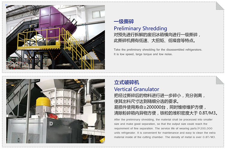 3E機械廢舊冰箱回收處理生產(chǎn)線,針對大容量冰箱及冰柜的破碎回收,設(shè)計獨特并獲得國家專利(ZL 2017 1 0005788.9),分選效果高,物料、粉塵及排氣分別進行,獨立抽風系統(tǒng),有利于環(huán)保及生產(chǎn)安全。