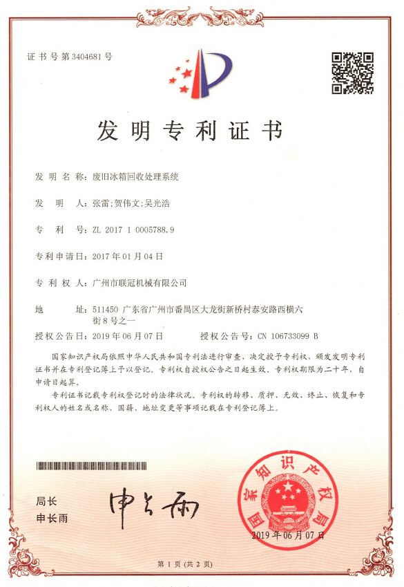 3E廢舊冰箱回收處理生產(chǎn)線獲國家發(fā)明專利