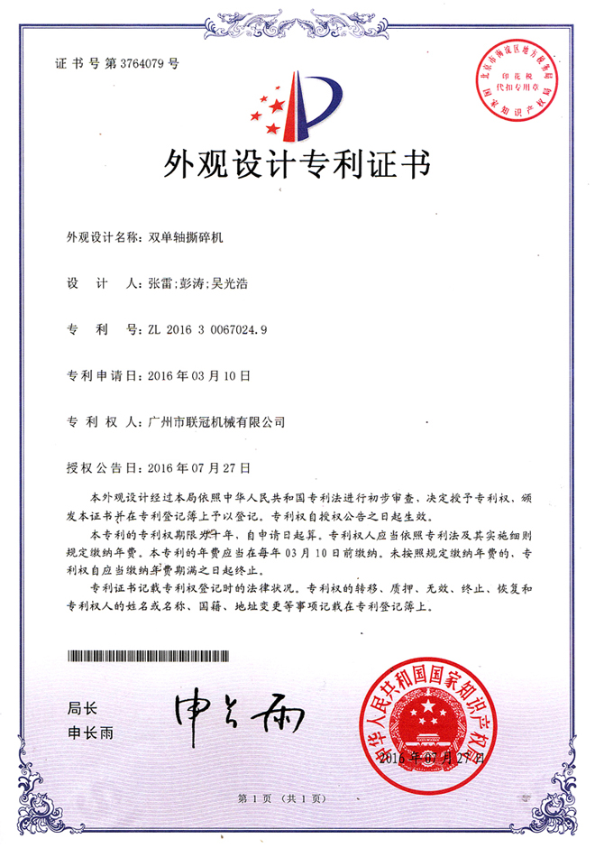 3E專利——雙單輥撕碎機(jī),美觀與實(shí)用并重。