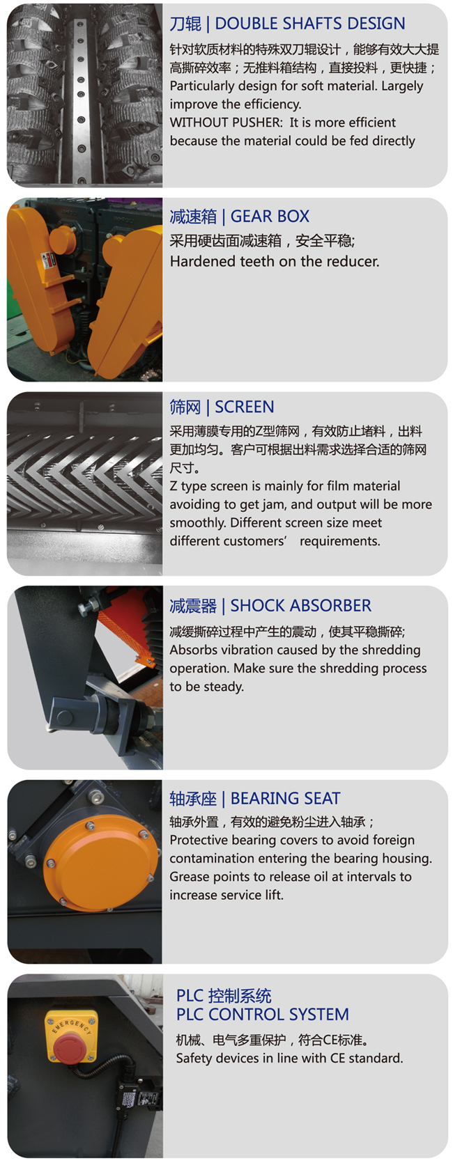 3E廣州聯(lián)冠機(jī)械的SWTF系列雙單輥撕碎機(jī)不僅獲得歐盟CE認(rèn)證,更獲得國(guó)家頒發(fā)的外觀設(shè)計(jì)專利,是一個(gè)外表風(fēng)度翩翩,內(nèi)涵豐富多樣實(shí)用度極高的系列。3E機(jī)械的SWTF系列雙單輥撕碎機(jī)采用雙薄膜刀輥結(jié)構(gòu),擁有中速、高效、低噪音等特點(diǎn)。設(shè)備針對(duì)撕碎薄膜、編織袋、噸袋、木材、紙張等中等硬度和較軟材質(zhì)的物料,不同的物料可選用不同的刀輥。該系列雙單輥撕碎機(jī)采用西門子控制系統(tǒng),設(shè)計(jì)有啟動(dòng)、停止、反轉(zhuǎn)及超載自動(dòng)反轉(zhuǎn)功能,可自動(dòng)控制。