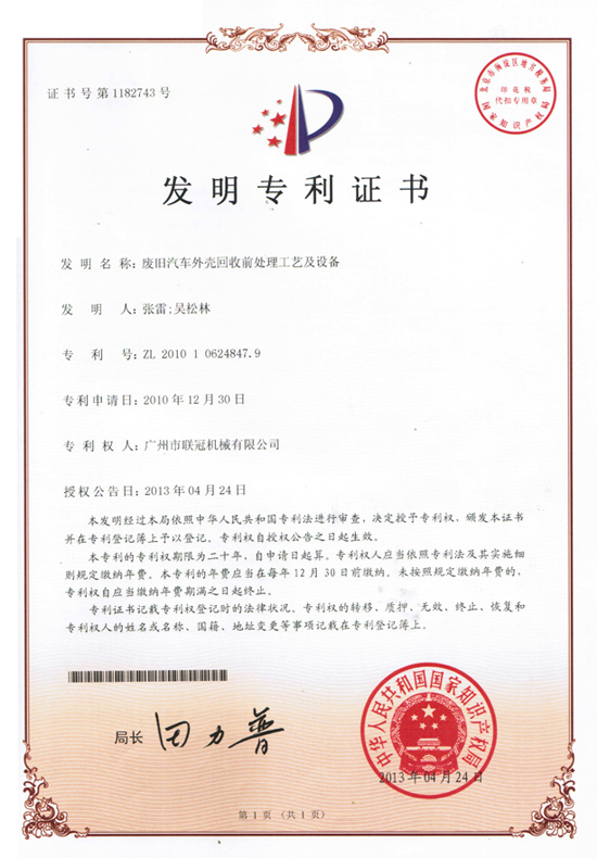 3E廣州聯(lián)冠機械的技術研發(fā)小組憑借多年的研發(fā)與積累,從簡單的“逆向創(chuàng)新”——外觀完善并獲得多項外觀設計專利;到核心技術的不斷探索、攻關——“正向創(chuàng)新”,妥妥的國家發(fā)明專利3項已寫入公司戰(zhàn)績,分別是旋轉刀輥、刀具組件及鋼絲分離機(ZL201510169218.4),撕碎機雙輥喂料裝置(ZL201410126169.1),廢舊汽車外殼回收前處理工藝及設備(ZL201010624847.9),另外還有20余項發(fā)明專利正在申報中。