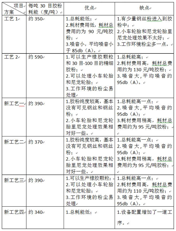 3E機械通過這幾年面對不同客戶的需求設(shè)計定制了這些方案,與國內(nèi)常用的工藝1比較,在能耗方面只有新工藝四能耗稍低,而其他新工藝在能耗和耗材方面,都要比工藝1高,但是如果面對客戶既要得到橡膠顆粒和橡膠粉以及40目以上的橡膠粉,或者客戶處理小車輪胎和尼龍?zhí)ィ瞧渌に囉钟兴膬?yōu)勢,因此需根據(jù)客戶實際情況來配置設(shè)備。
