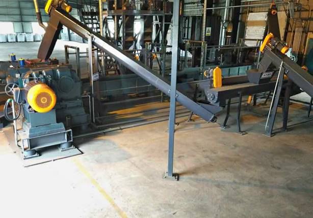 新工藝二:雙軸撕碎機(出料50X50mm膠塊)+鋼絲分離機(或叫中碎機)(出料15mm膠粒)+雙溝輥破膠機;