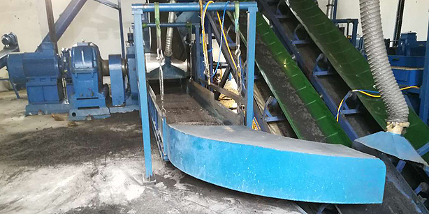 工藝2: 雙軸撕碎機(出料50X50mm膠塊)+鋼絲分離機(或叫中碎機)(出料15mm膠粒)+橡膠破碎機(或叫細碎機)(出料小于4mm膠粒)+橡膠磨粉機。