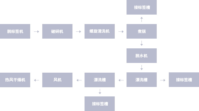 生產(chǎn)線主要由特制的瓶片式撕碎機/破碎機,螺旋上料機,預(yù)洗機,脫標簽機,立式脫水機, 干燥器等設(shè)備組成,整套設(shè)備自動化程度高, 能耗低,效率高,清洗干凈等特點,有效地把廢舊PET瓶變成可再利用的PET原料。運用回收材料生產(chǎn)高品質(zhì)產(chǎn)品,用于銷售或者拉絲,造粒吹瓶。 |